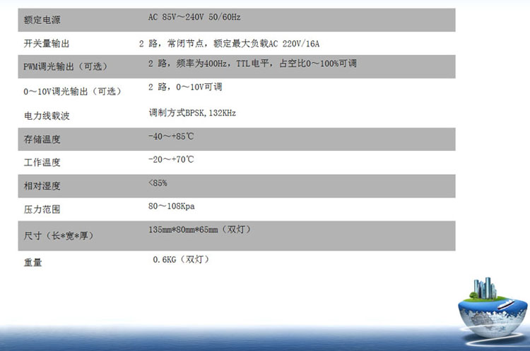 ■ 调光控制功能:GF-LCS102双灯控制器提供两路PWM或两路0—10V的模拟量输出,可对电子镇流器/LED路灯等进行调光;提供两    路恒定功率输出,可对电感式高压钠灯等进行调光。