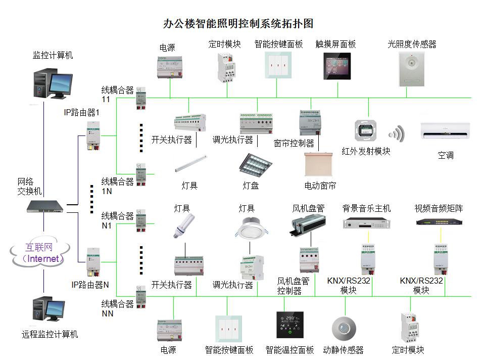 ●控制方式灵活多样:包括智能面板、触摸屏面板、光照度感应、人体感应、气象感应、温度感应、定时控制、远程网络控制、中控电脑等,适应不同类型办公楼的控制需要。