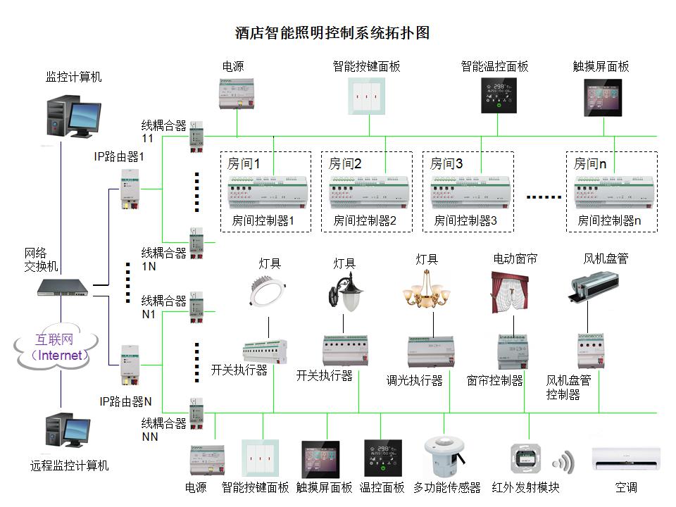 ●控制方式灵活多样:包括智能面板、触摸屏面板、光照度感应、人体感应、气象感应、温度感应、定时控制、远程网络控制、中控电脑等,适应酒店多样化的控制需要。
